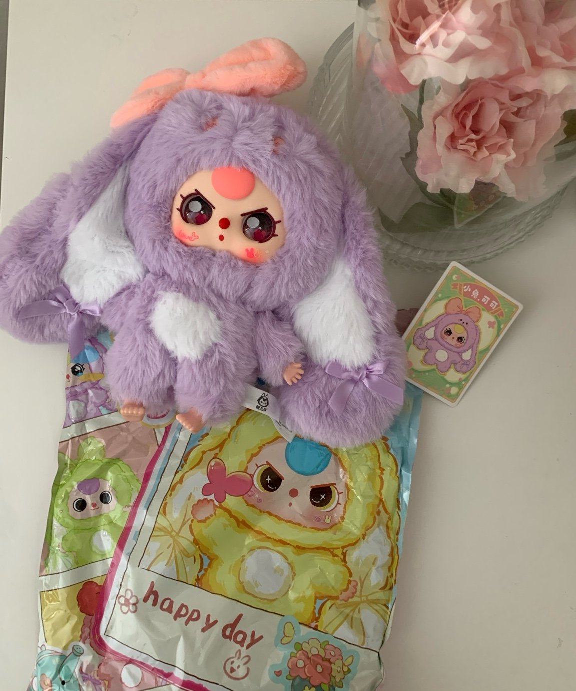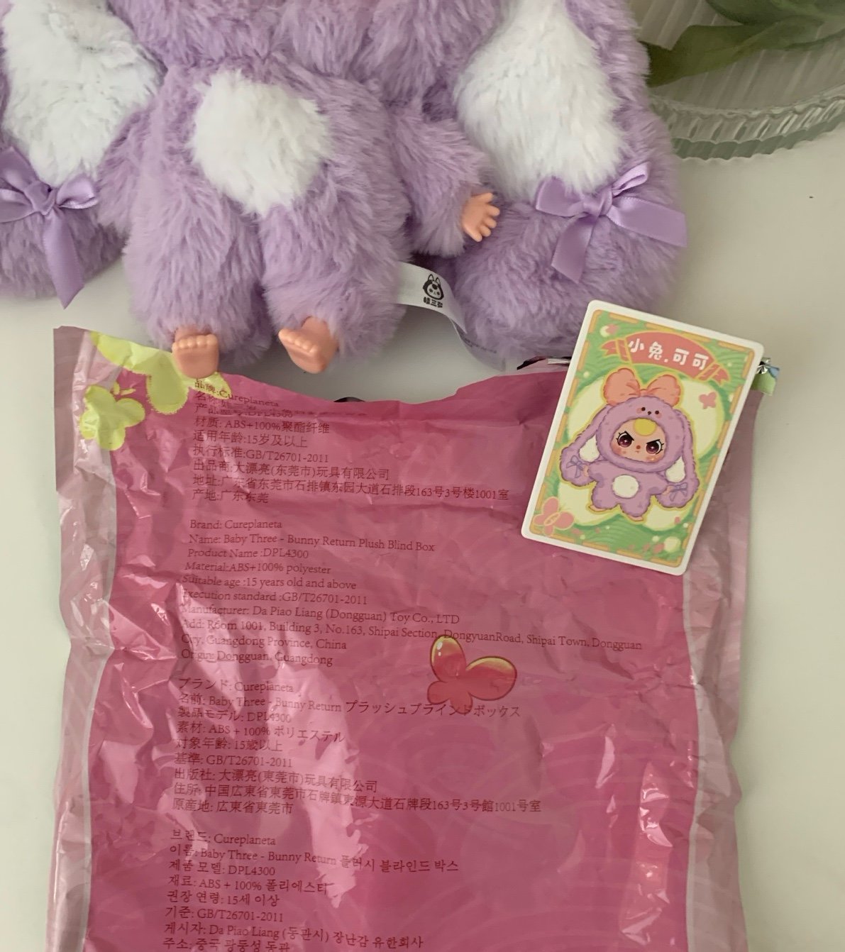 Includes collector card, plastic bag, plush